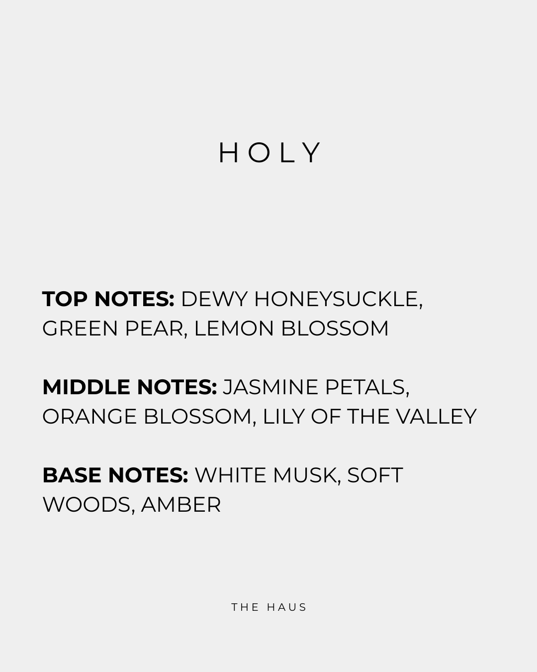 HOLY is light-made fragrance. It opens with dewy honeysuckle, green pear, and lemon blossom—fresh, radiant, and tender. At its heart, jasmine petals, orange blossom, and lily of the valley bloom into a luminous bouquet, soft and sacred. The base lingers with white musk, soft woods, and amber—a pure, glowing finish that feels like quiet devotion on the skin.