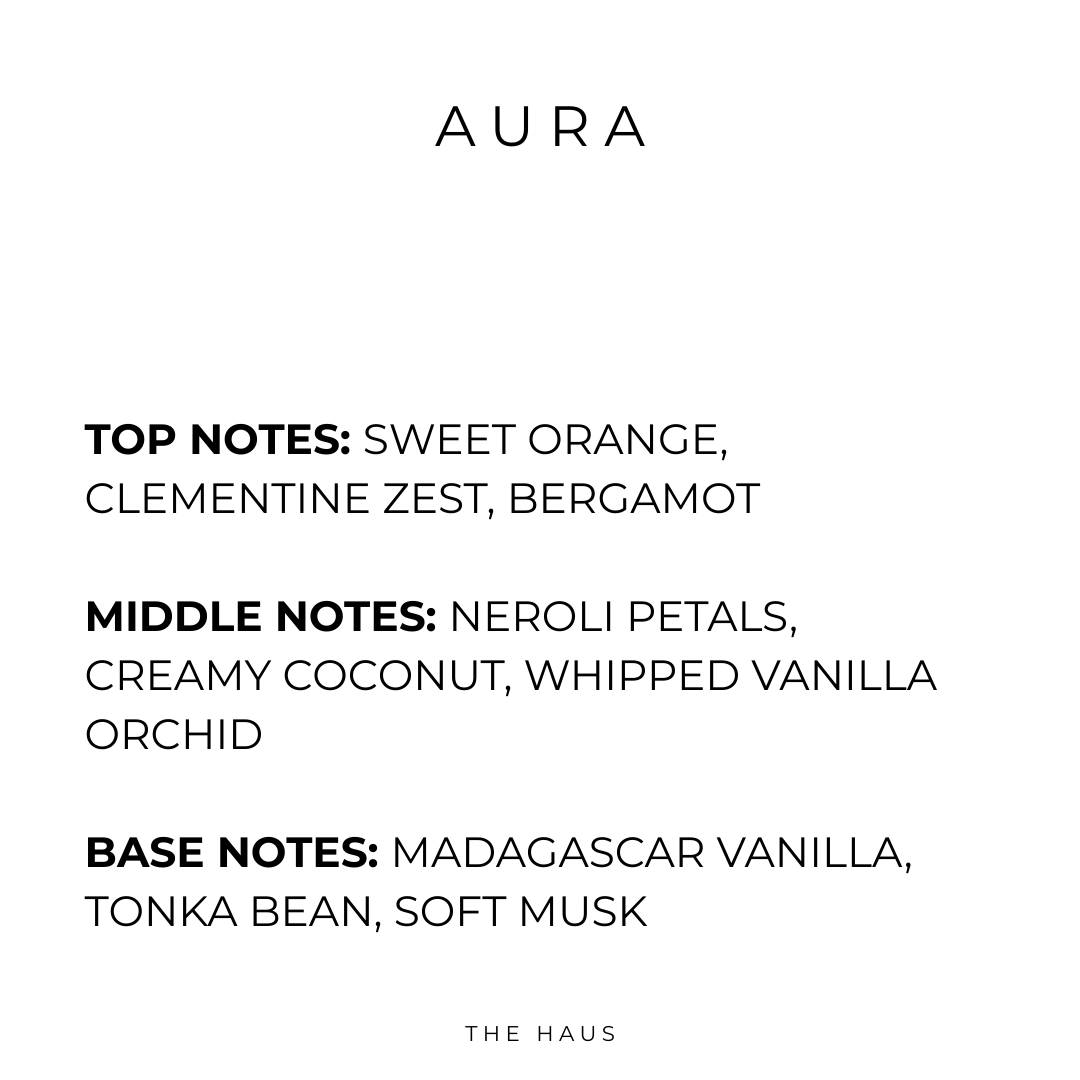AURA is a luminous veil, both playful and alluring. It opens with the juicy sweetness of orange, clementine zest, and bergamot—a sparkling burst of citrus light. Its heart drapes in neroli petals and creamy coconut, softened with the indulgence of whipped vanilla orchid. The base lingers with Madagascar vanilla, tonka bean, and soft musk, wrapping the skin in a delicate, magnetic glow.