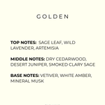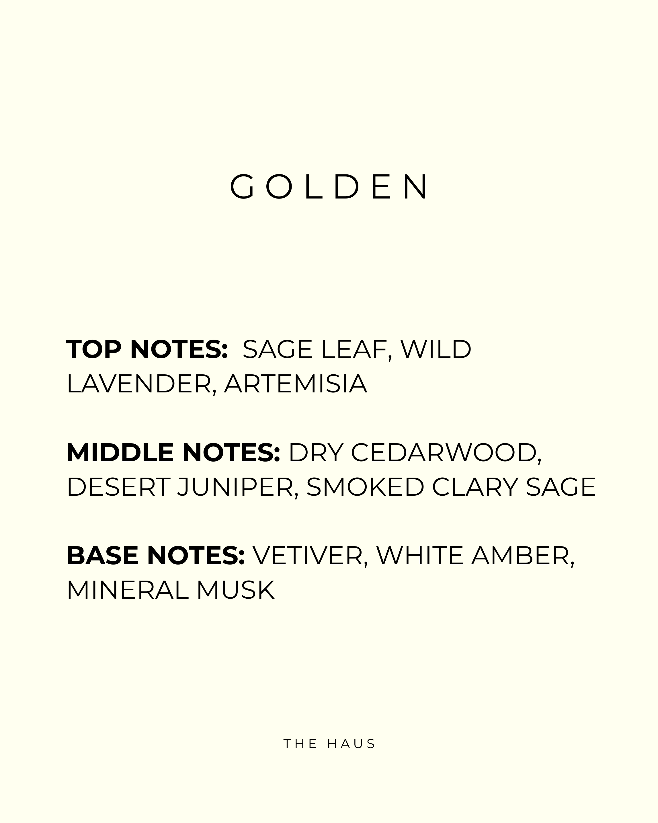 GOLDEN captures the heat of earth and sun. It opens with crushed sage leaf, wild lavender, and artemisia—sharp, herbaceous, and bright with desert air. At its heart, dry cedarwood, desert juniper, and smoked clary sage unfold like a sun-bleached landscape, both dry and luminous. The base rests in vetiver, white amber, and mineral musk—a radiant warmth that lingers like sunlight on skin.