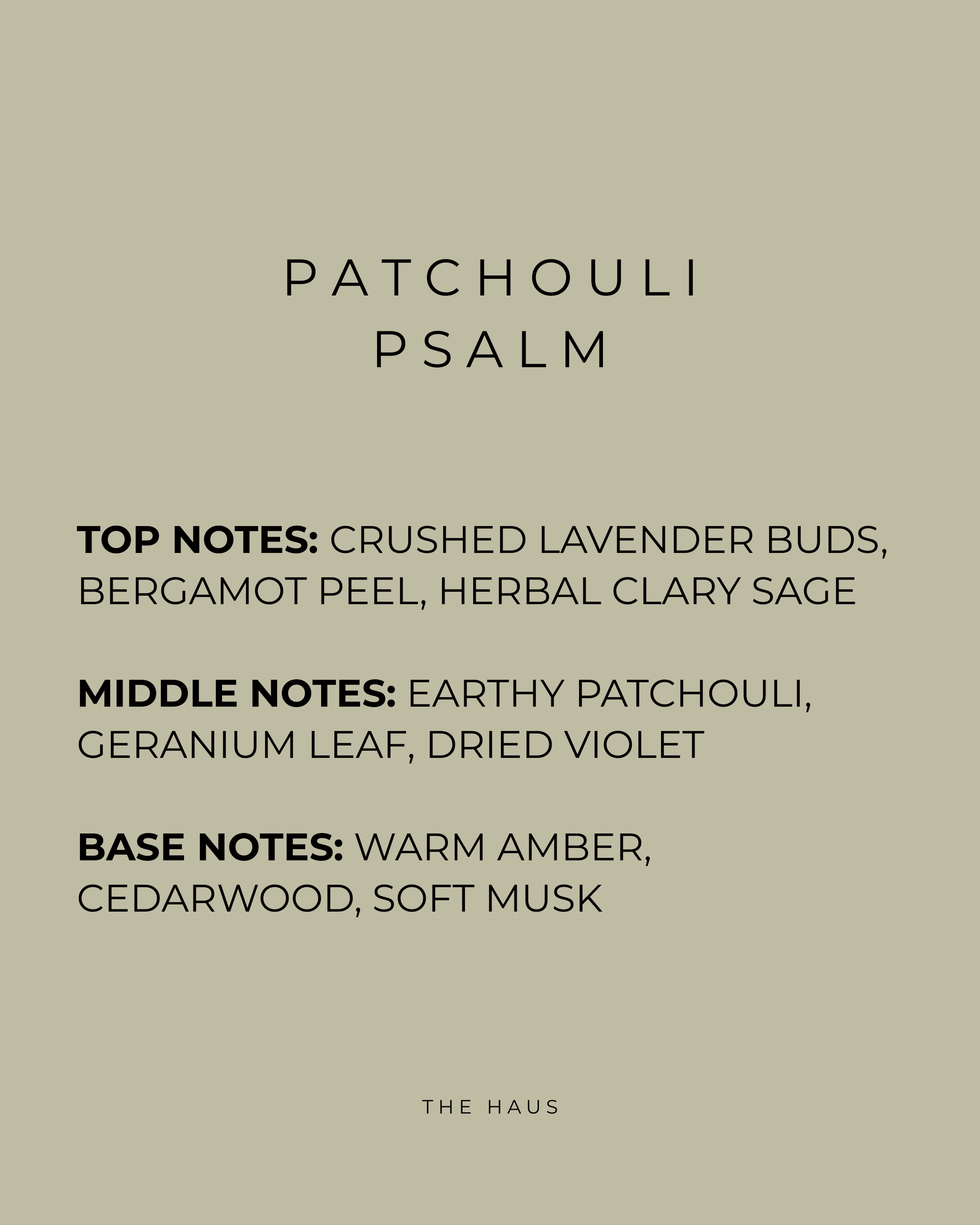 PATCHOULI PSALM is an ode to earth and prayer. It opens with crushed lavender buds, bergamot peel, and herbal clary sage—aromatic, cleansing, and serene. At its heart, earthy patchouli folds into geranium leaf and dried violet, deepening into a rich, grounding accord. The base rests in warm amber, cedarwood, and soft musk—a devotional warmth that lingers like a whispered hymn on the skin.
