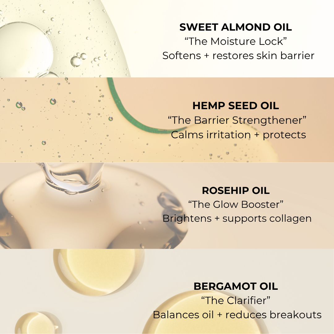 INGREDIENTS: Sweet Almond Oil, Hemp Seed Oil, Rosehip Seed Oil, Bergamot Essential Oil